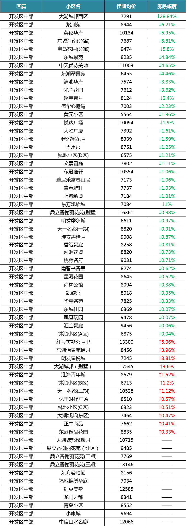 值得注意的是,在11月份开发区中部的二手房跌幅较大的小区有很多,其中跌幅最高的大湖城邦西区,跌幅竟然达到恐怖的↓28.84%。