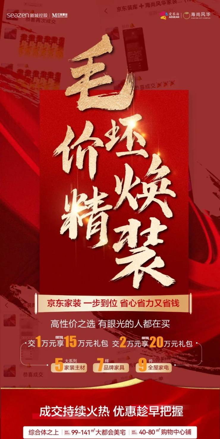 还有南部新城海尚风华的“毛坯价焕精装”购房活动:交1万元可享价值约15万元礼包,交2万元享价值约20万元礼包。