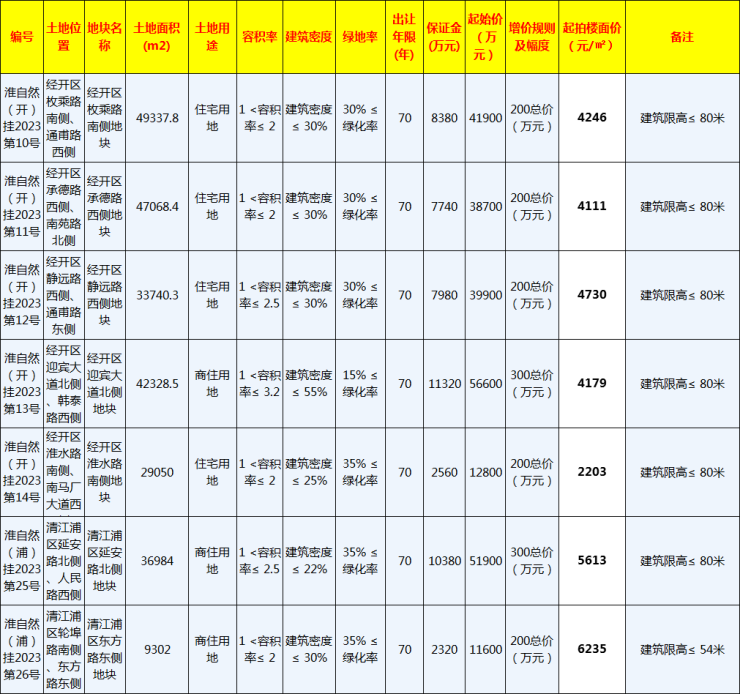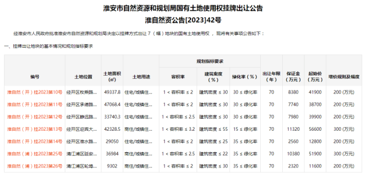 7宗地块均为商品房宅地,并且全部取消地价上限,淮安土拍又回到此前价高者得时期!