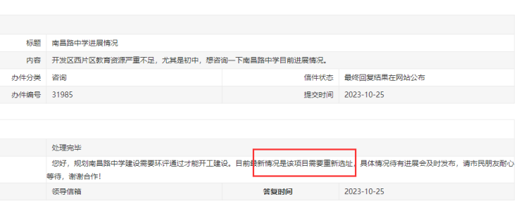 小编也查阅了经开区管委会的政民互动,发现确实该所学校的选址需要重新选址!