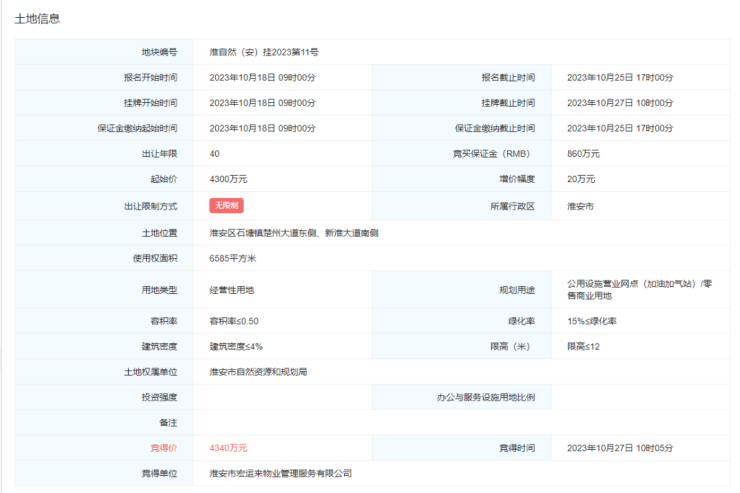 在土地开拍之前,便已经有两轮报价,最终3轮报价被淮安市宏运来物业管理服务有限公司竞得。