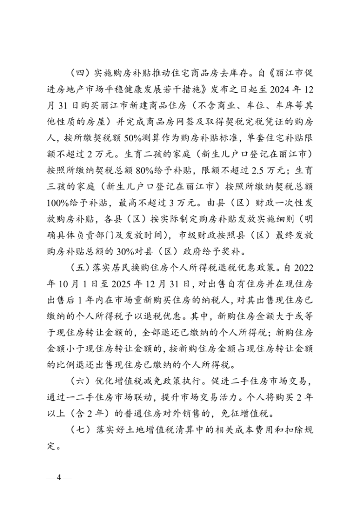 《通知》明确实施购房补贴推动住宅商品房去库存。自《丽江市促进房地产市场平稳健康发展若干措施》发布之日起至2024年12月31日购买丽江市新建商品住房(不含商业、车位、车库等其他性质的房屋)并完成商品房网签及取得契税完税凭证的购房人,按所缴契税额50%测算作为购房补贴标准,单套住宅补贴限额不超过2万元。生育二孩的家庭(新生儿户口登记在丽江市)按照所缴纳契税总额80%给予补贴,限额不超过2.5万元;生育三孩的家庭(新生儿户口登记在丽江市)按照所缴纳契税总额100%给予补贴,最高不超过3万元。由县(区)财政一次性发放购房补贴,各县(区)按实际制定购房补贴发放实施细则(明确具体负责部门及发放时间),市级财政按照县(区)最终发放购房补贴总额的30%对县(区)政府给予奖补。