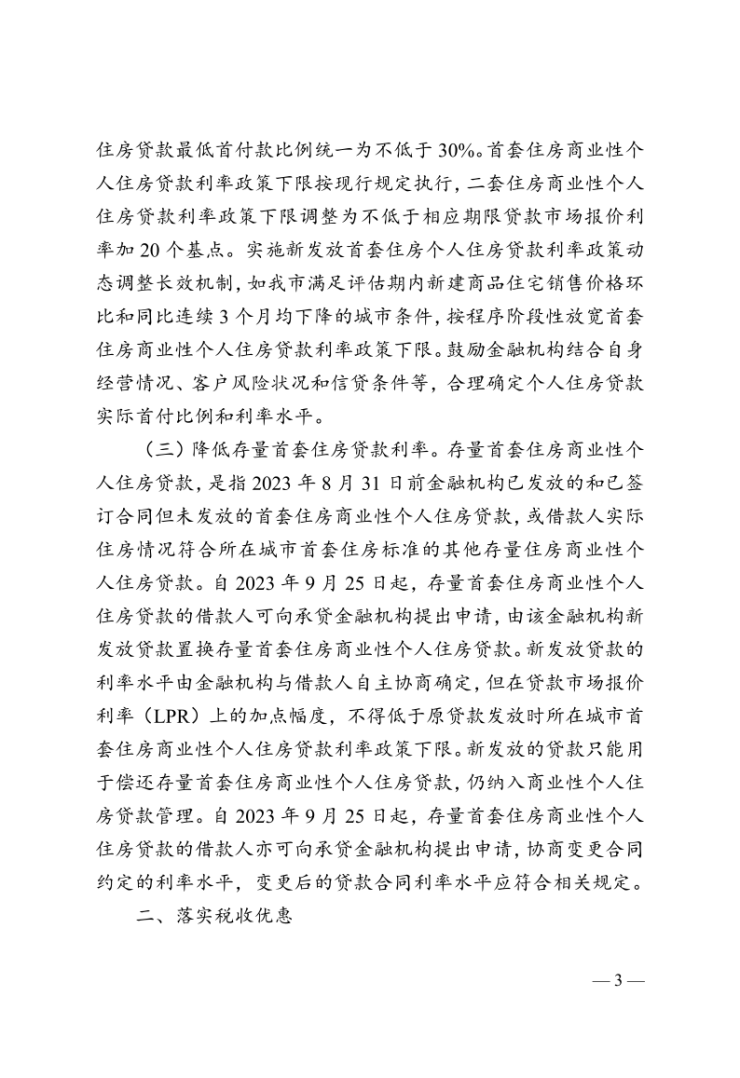 实行“认房不认贷”住房信贷政策。居民家庭(包括借款人、配偶及未成年子女)申请贷款购买商品住房时,家庭成员在拟购房所在县级行政区域名下无成套住房的,不论是否已利用贷款购买过住房,银行业金融机构均按首套住房执行住房信贷政策。对于贷款购买商品住房的居民家庭,首套住房商业性个人住房贷款最低首付款比例统一为不低于20%,二套住房商业性个人住房贷款最低首付款比例统一为不低于30%。首套住房商业性个人住房贷款利率政策下限按现行规定执行,二套住房商业性个人住房贷款利率政策下限调整为不低于相应期限贷款市场报价利率加20个基点。