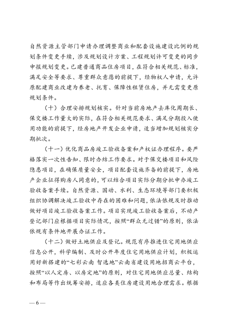 在优化土地和规划审批方面,《通知》要求合理调整规划。在土地出让前,根据片区公共服务设施和基础设施配套承载力,商业商务用房配置、去化等情况,可由属地政府按程序依法开展控制性详细规划修改,详细规划修改完成后依法出让土地。已出让的商业用地,优先调整为养老、教育、文化等公共服务设施、保障性租赁住房用地,若调整为商住混合用地,则应满足其商业用地主导性质不变,且住宅用地面积不低于30亩、容积率不小于1.0的要求,按程序依法开展控制性详细规划修改,调整后依法补交土地出让金。规划用地性质为住宅用地,但达不到最小用地规模、不具备整合开发条件的小宗地块,按照城市功能需求,实施为城镇社区服务设施、养老服务设施、幼儿园、托儿所、停车场、公共公益、商业服务等补足城市短板、完善城市功能项目的,无需进行控规修改,无需变更规划条件,容积率按照规划条件上限控制,用地性质按照主要用途及功能确定。
